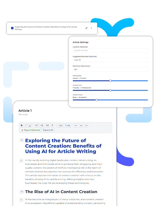 Starting from a target keyword, generate an engaging topic and generate an SEO rich article in seconds.